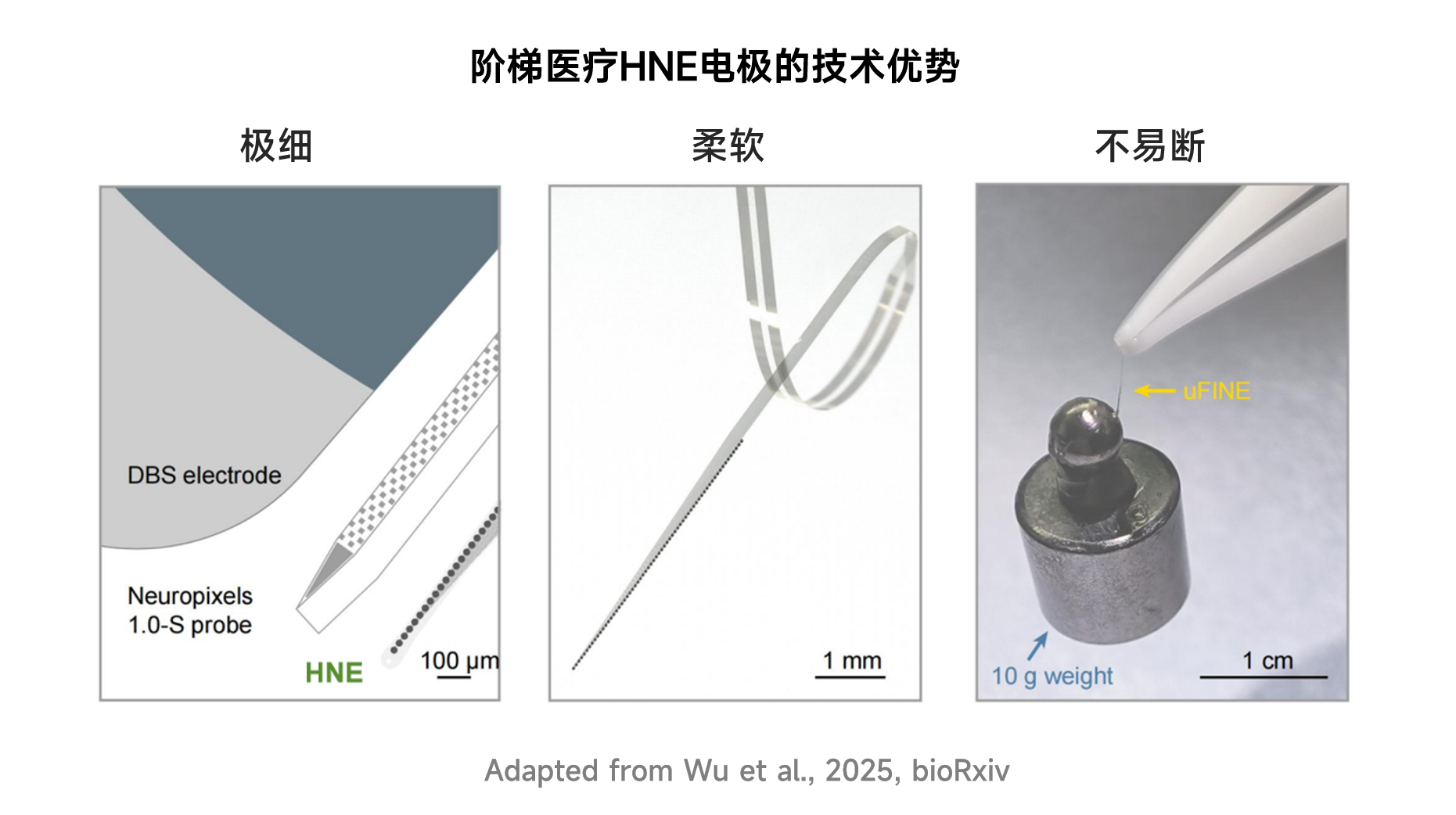 阶梯医疗超柔性电极拥有独特的物理特性,从根本上克服了传统刚性电极的局限:它极细、极柔软,力学性能与脑组织高度匹配,同时又具备优异的韧性,不易在植入或长期使用中断裂。