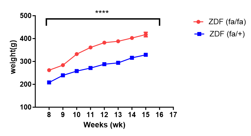 经特殊饲料诱导后, 8-16w时,ZDF(fa/fa)组体重与对照相比显著增加(p<0.0001)。