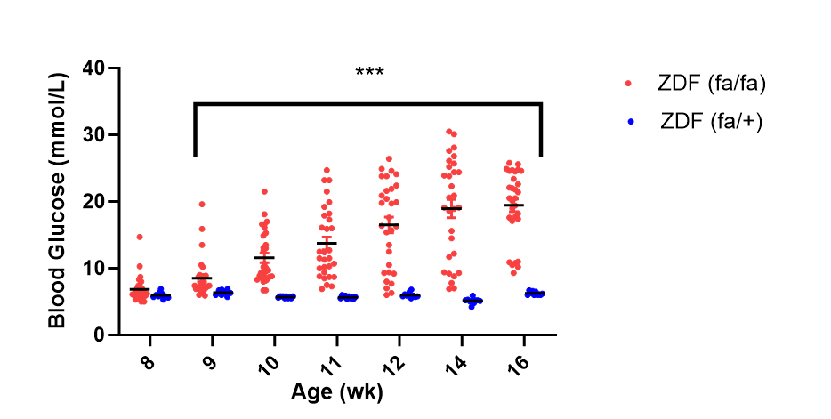 维通利华可以提供经诱导成模的12周龄以上的糖尿病模型,也可以提供小周龄的ZDF大鼠,供客户进行前期药物干预阶段的研究及肥胖相关的研究。
