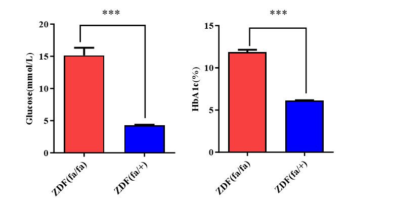 成模动物:直接购买诱导完成的ZDF大鼠,动物周龄通常为12周龄及以上,确保在出货前,动物随机血糖值>11.1 mmol/L(达到临床糖尿病诊断阈值)。
