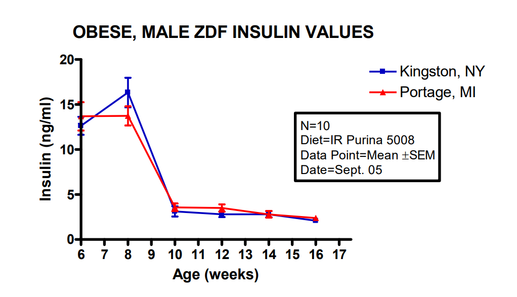 临床前有多种模型可以诱导糖尿病模型,如STZ药物诱导小鼠模型,瘦素及瘦素受体缺乏的ob及db小鼠等;随着药物研发靶点的深入,对肥胖/糖尿病大鼠模型的需求在进一步增加,本文重点介绍一款Zucker Diabetic Fatty (ZDF)近交系大鼠,雄性纯合子 (fa/fa)表现为瘦素受体缺失 (Lepr突变),通过基因突变并结合饲喂5008饲料,该模型能高度模拟人类成人发病型糖尿病(2型)及其相关并发症。ZDF大鼠是研究2型糖尿病的精确模型,其原因是由遗传性肥胖基因突变导致的葡萄糖耐量受损,进而引发胰岛素抵抗。ZDF大鼠7周龄时血糖开始升高,肥胖雄性大鼠在12周龄及以上发展为糖尿病。在6至9周龄期间,血液胰岛素水平很高,但随后会下降,因为胰腺β细胞受损并停止对葡萄糖刺激作出反应。